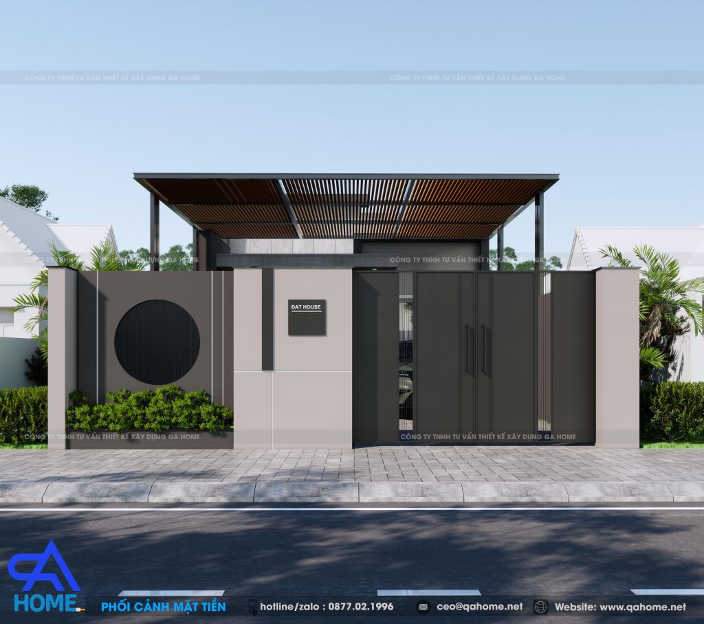 Cổng nhà được thiết kế kiên cố với họa tiết hình tròn độc đáo, vừa tạo nên nét phá cách hiện đại, vừa gợi lên hình ảnh viên mãn, sung túc trong phong thủy. Đây không chỉ là điểm nhấn thẩm mỹ ở phần ngoại thất mà còn là lời chào đón ấm áp, mang lại sự may mắn và bình an cho gia chủ.